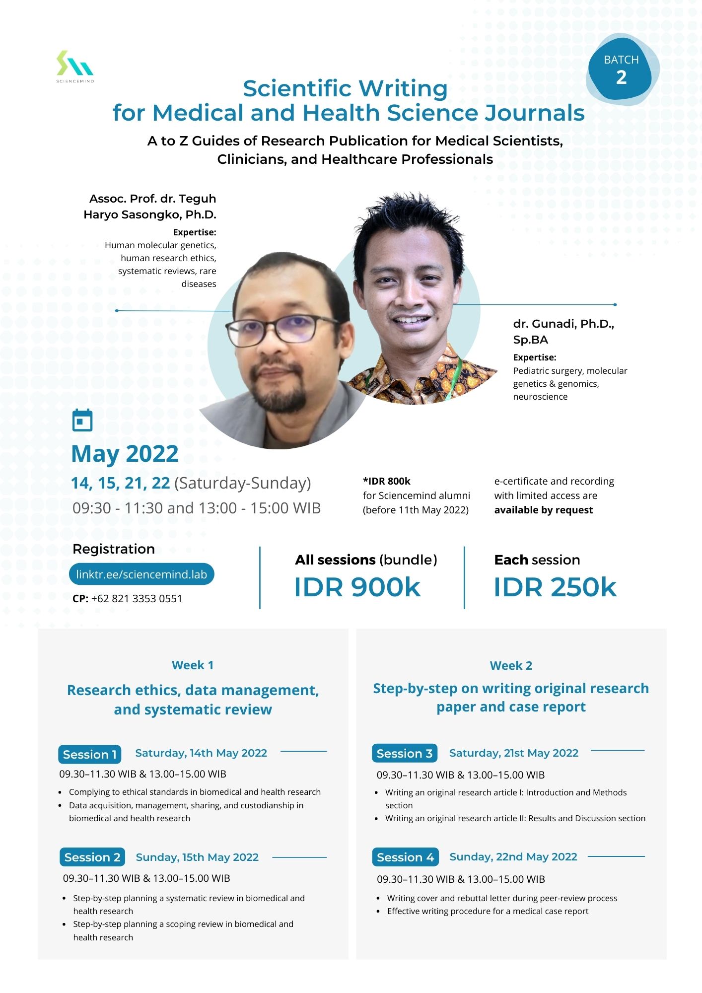 Publikasi ilmiah menjadi tantangan bagi tenaga medis di Indonesia. Hal ini dikarenakan banyak temuan kasus klinis namun tidak terdokumentasi secara sistematis. Mari, pelajari strategi manajemen data kesehatan, etika seputar riset kesehatan dan biomedis, seluk beluk proses peer-review, dan cara mengembangkan keterampilan menulis artikel ilmiah “systematic review”, “scoping review”, “original report”, dan “case report" dari dasar bersama peneliti yang berpengalaman.
