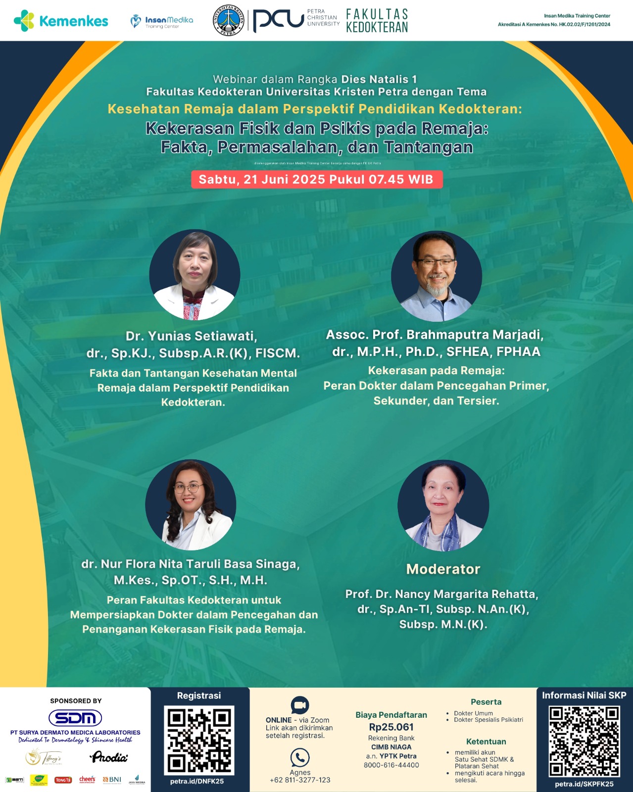 Webinar ini akan membahas berbagai fakta lapangan mengenai kekerasan terhadap remaja, bentuk dan dampaknya terhadap kesehatan fisik maupun mental, serta tantangan yang dihadapi oleh tenaga kesehatan, pendidik, dan masyarakat, serta peran Fakultas Kedokteran sebagai institusi yang melahirkan tenaga kesehatan dalam menciptakan lingkungan yang aman dan mendukung tumbuh kembang remaja secara holistik.