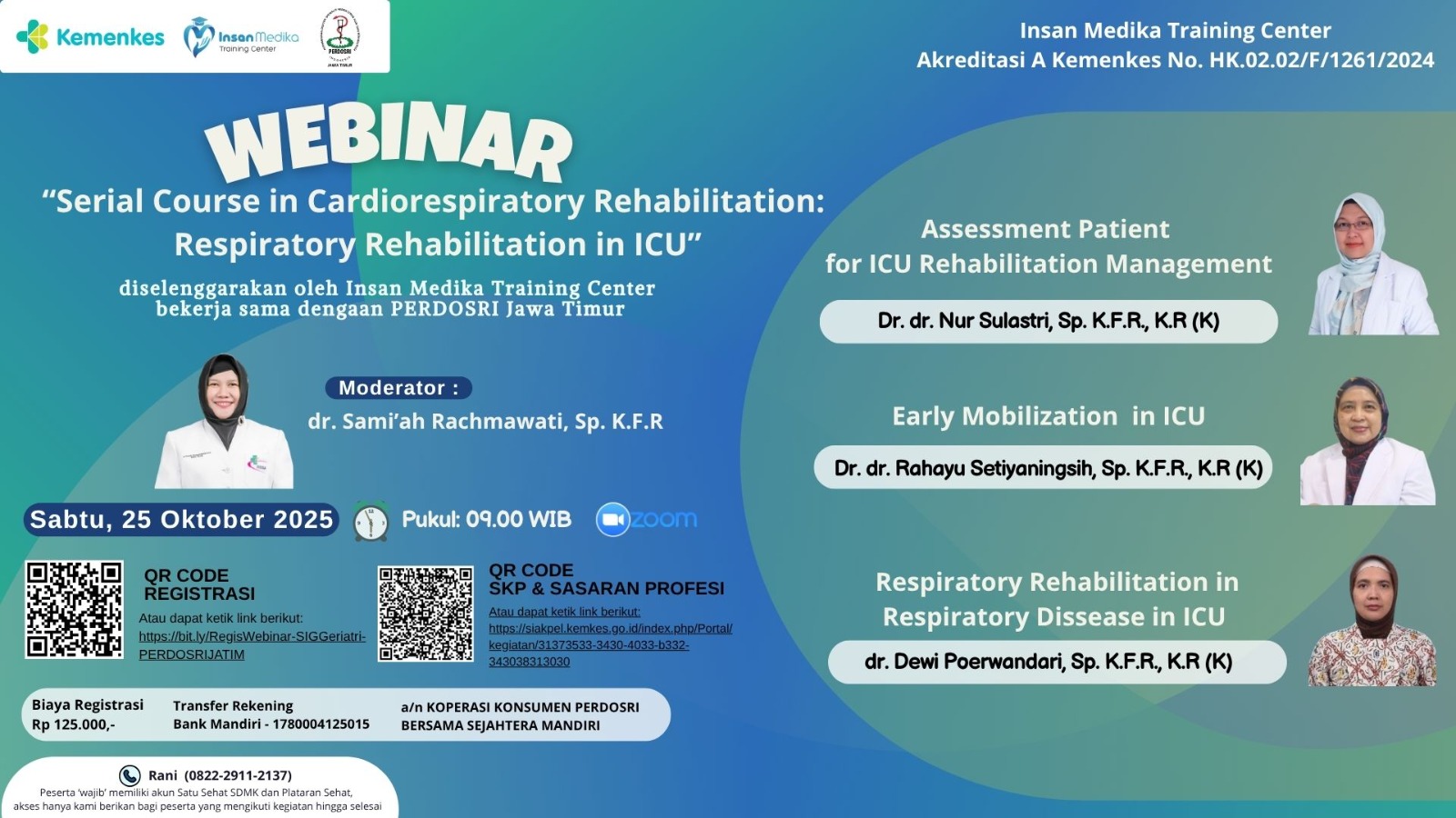 Pasien di ICU sering mengalami gangguan pernapasan kompleks akibat penyakit neuromuskular dan penyakit respirasi berat seperti ARDS dan PPOK, yang menyebabkan kelemahan otot pernapasan dan ketergantungan ventilator. Imobilisasi berkepanjangan juga memperparah kondisi melalui ICU-acquired weakness dan risiko komplikasi seperti pneumonia dan gagal weaning. Rehabilitasi respirasi dini yang terstruktur terbukti efektif dalam memperbaiki fungsi paru, mempercepat pemulihan, dan meningkatkan kualitas hidup, meskipun penerapannya masih menghadapi berbagai tantangan. Webinar ini diselenggarakan untuk meningkatkan pemahaman dan keterampilan tenaga kesehatan, khususnya dokter Sp. KFR, dalam menangani rehabilitasi respirasi di ICU secara optimal.