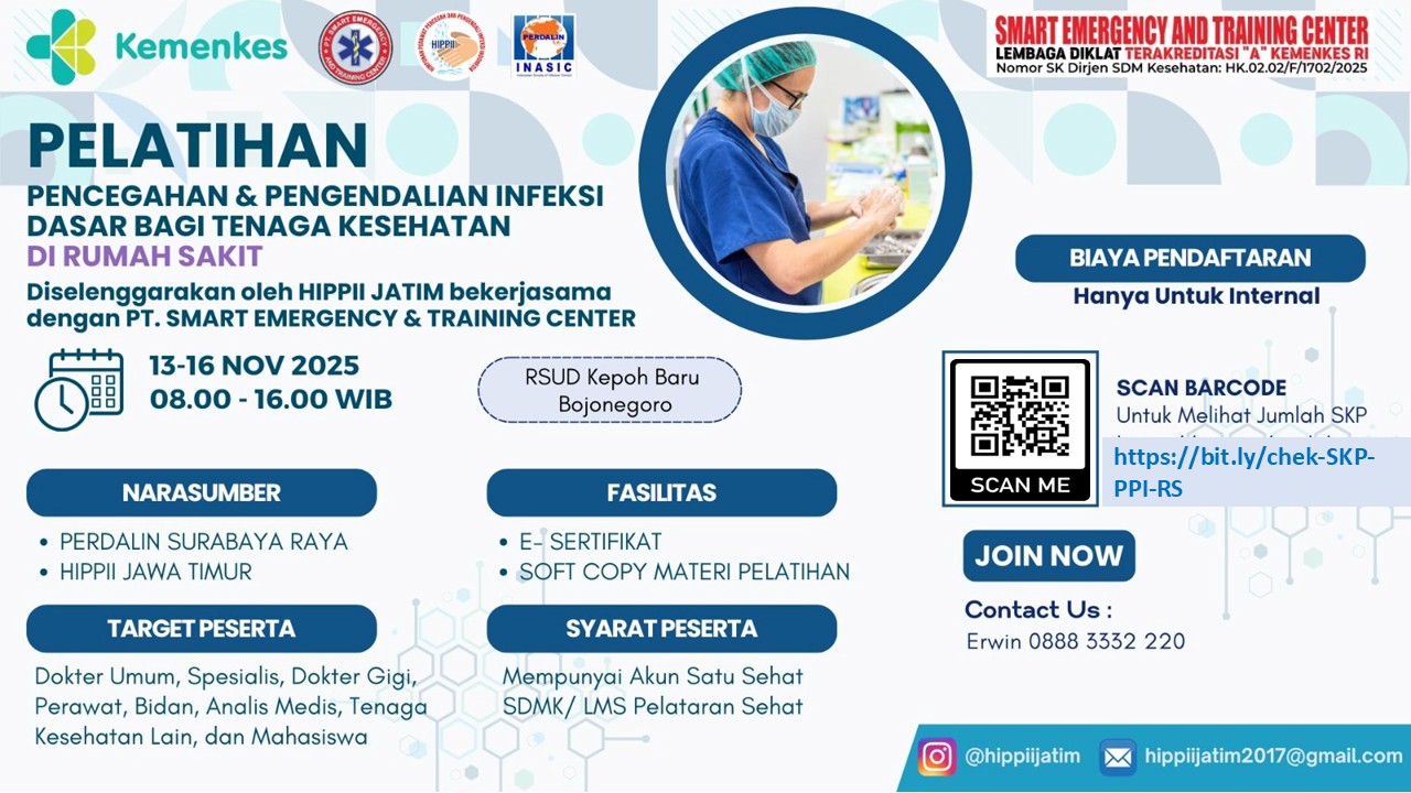 Oleh karena itu kami PT SMART EMERGENCY & Training Center, menyelenggarakan pelatihan pencegahan pengendalian infeksi (PPI) dasar ini, tenaga kesehatan yang melakukan pelayanan di rumah sakit mampu melaksanakan upaya pencegahan & pengendalian infeksi. Pelatihan PPI Dasar ini merupakan salah satu pelatihan yang diwajibkan bagi seluruh tenaga di rumah sakit sesuai dengan WHO Infection Prevention Control Assessment Framework (IPCAF). Agar pelatihan ini dilaksanakan sesuai dengan kaidah yang berlaku sesuai standar akreditasi pelatihan Kemenkes maka disusun kurikulum pelatihan ini sebagai acuan pelaksanaan pelatihan PPI dasar rumah sakit .