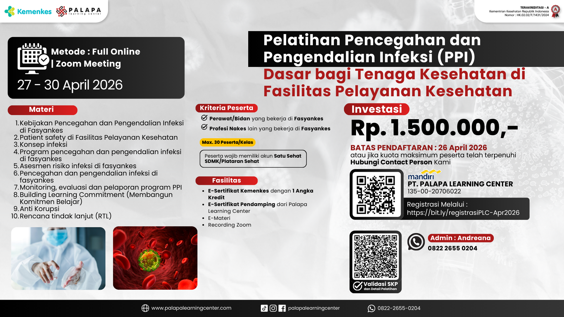 • Tujuan: Setelah mengikuti pelatihan, peserta berperan sebagai pelaksana pencegahan dan pengendalian infeksi (PPI) di fasilitas pelayanan kesehatan.