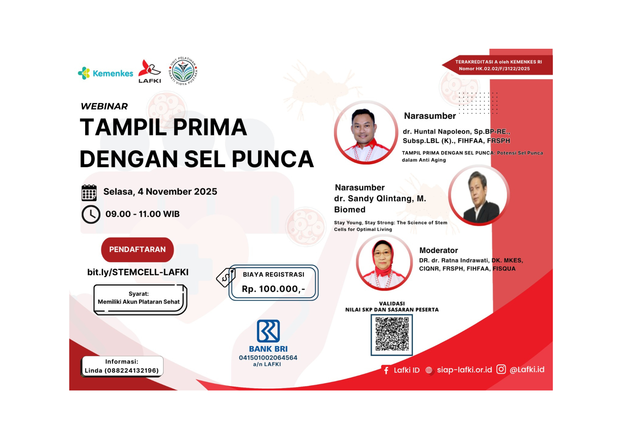 Webinar “Tampil Prima dengan Sel Punca” merupakan kegiatan ilmiah yang membahas inovasi terkini dalam kedokteran regeneratif, khususnya pemanfaatan sel punca (stem cell) untuk menjaga vitalitas, memperlambat proses penuaan, serta meningkatkan kualitas hidup. Kegiatan ini menghadirkan narasumber ahli di bidangnya untuk memberikan wawasan ilmiah, penerapan klinis, dan prospek pengembangan terapi sel punca di Indonesia, sebagai bagian dari upaya peningkatan pengetahuan dan mutu pelayanan kesehatan.