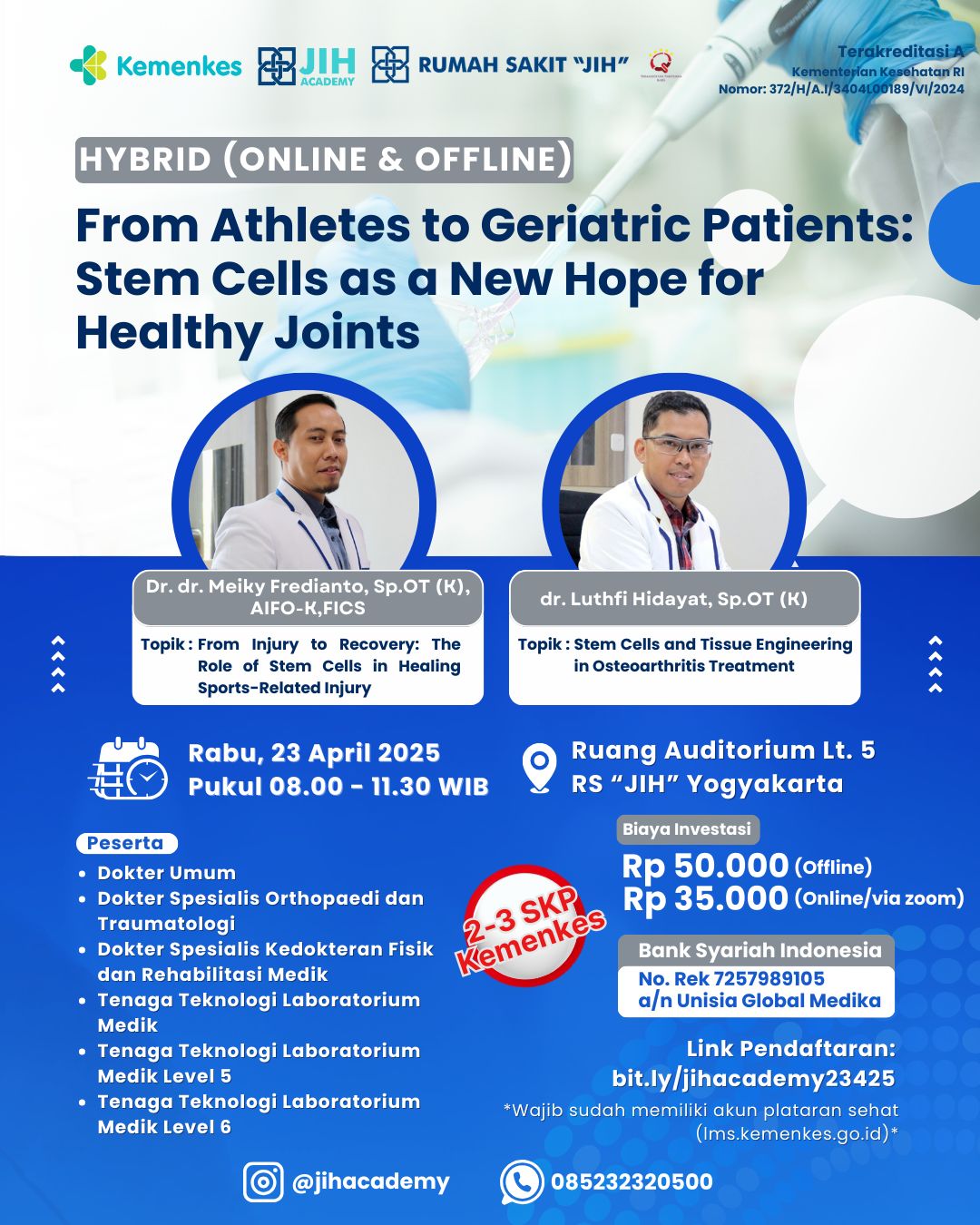 Menjelajahi potensi terapi Stem Cell dalam menjaga kesehatan sendi, Yuk Ikuti seminar hybrid ber-SKP Kemenkes RI dengan judul ✨“From Athletes to Geriatric Patients: Stem Cells as a New Hope for Healthy Joints”✨