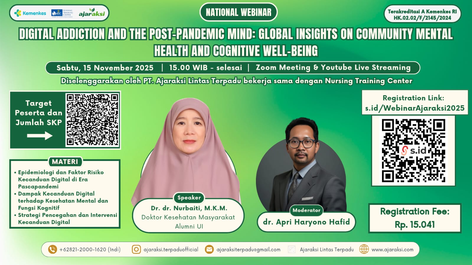 • Tujuan: Meningkatkan pengetahuan, kesadaran, dan peran aktif peserta (terutama tenaga kesehatan) dalam memahami fenomena kecanduan digital serta dampaknya terhadap kesehatan mental masyarakat, sekaligus mengembangkan kemampuan untuk mencegah dan menanggulangi efek negatif kecanduan digital secara komprehensif berbasis bukti ilmiah.