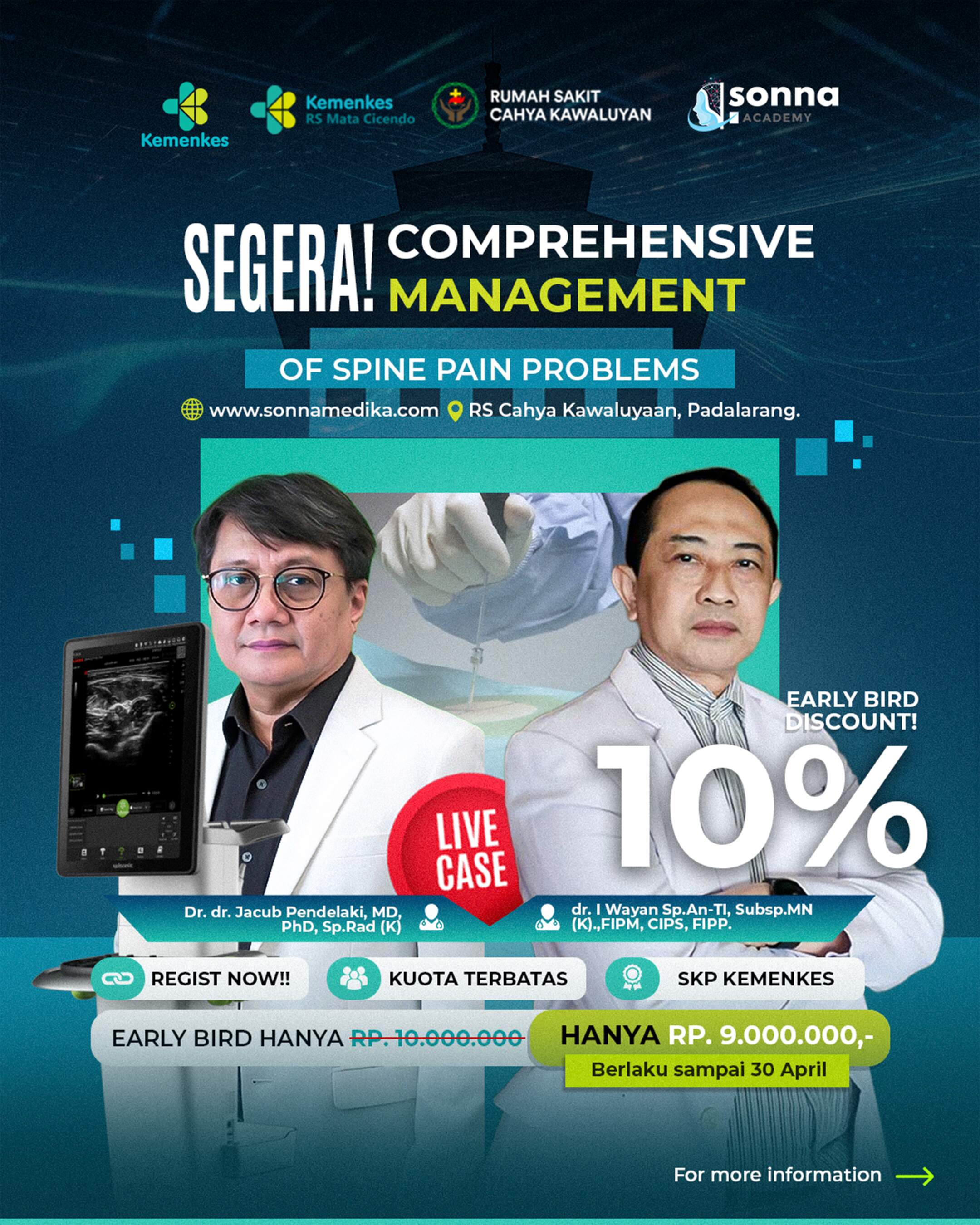 Comprehensive Management of Spine Pain Problems (CMSPP) adalah workshop medis intensif yang menghadirkan kolaborasi ahli dari berbagai bidang (Radiologi, Anestesi, dan Bedah Saraf) untuk membahas penanganan nyeri tulang belakang secara mendalam dan presisi.