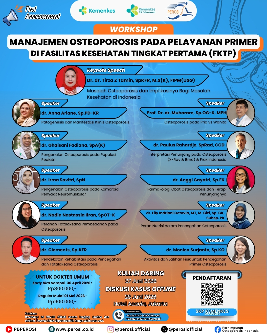 PB. PEROSI akan menyelenggarakan Workshop Manajemen Osteoporosis pada Pelayanan Primer di FKTP, yang akan dilaksanakan pada :