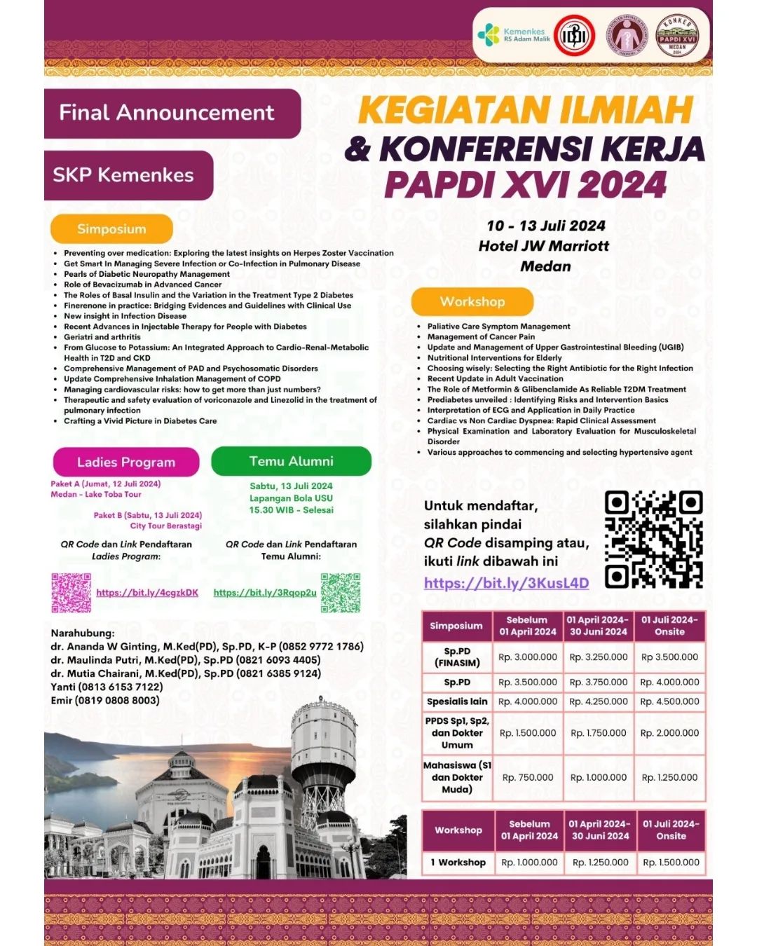 Perhimpunan Dokter Spesialis Penyakit Dalam Indonesia dengan hormat mengundang Prof./Dr./dr untuk dapat mengikuti Konker PAPDI XVI 2024 yang diselenggarakan di Medan dengan berbagai kegiatan: