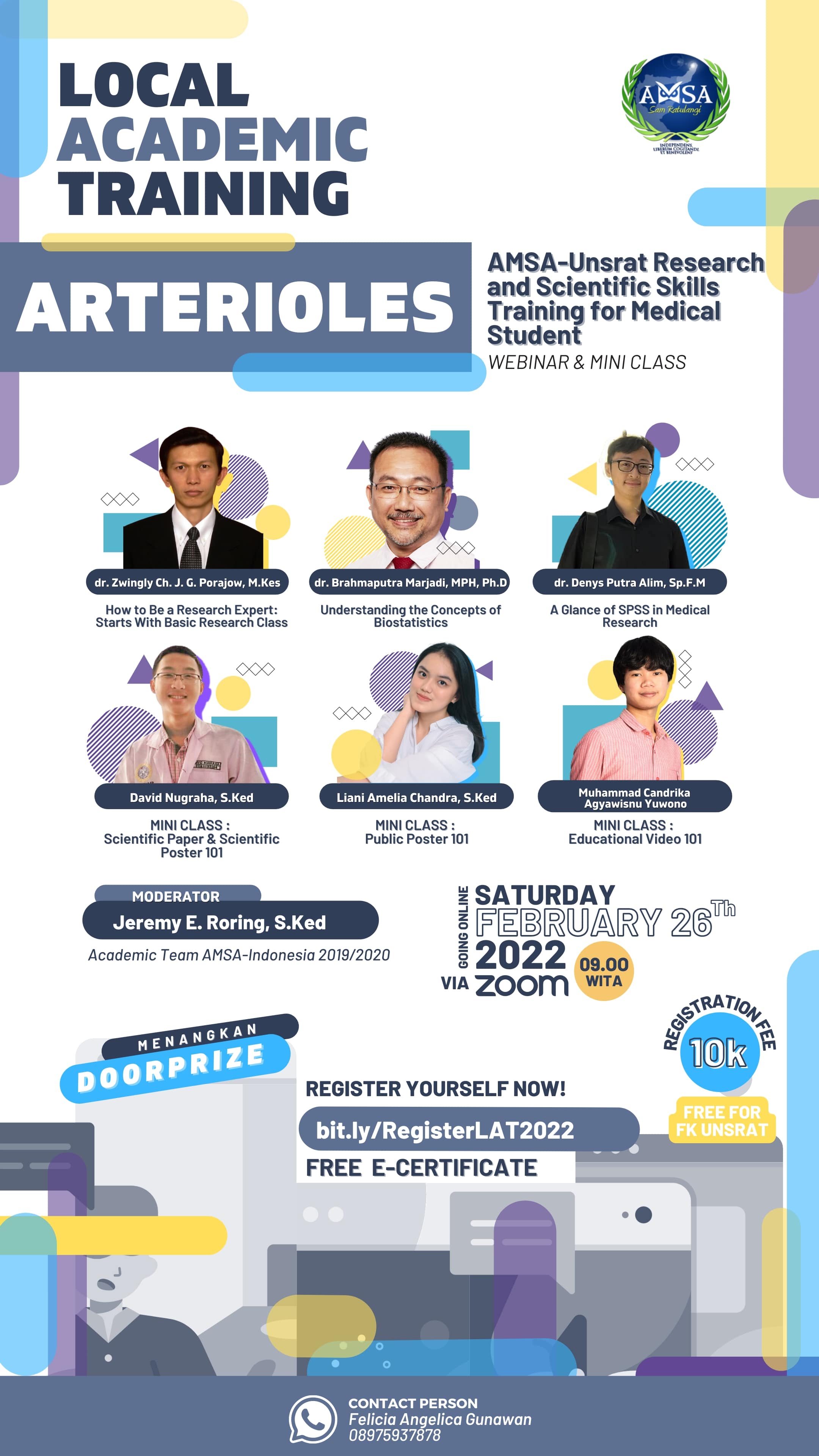 AMSA-Unsrat tenure 2021/2022 proudly presents a program entitled Local Academic Training: ARTERIOLES (AMSA-Unsrat Research and Scientific Skills Training for Medical Students) that aims to develop the essential knowledge and skill of participants regarding research and scientific works. This event will consist of Webinar and Mini Class.
