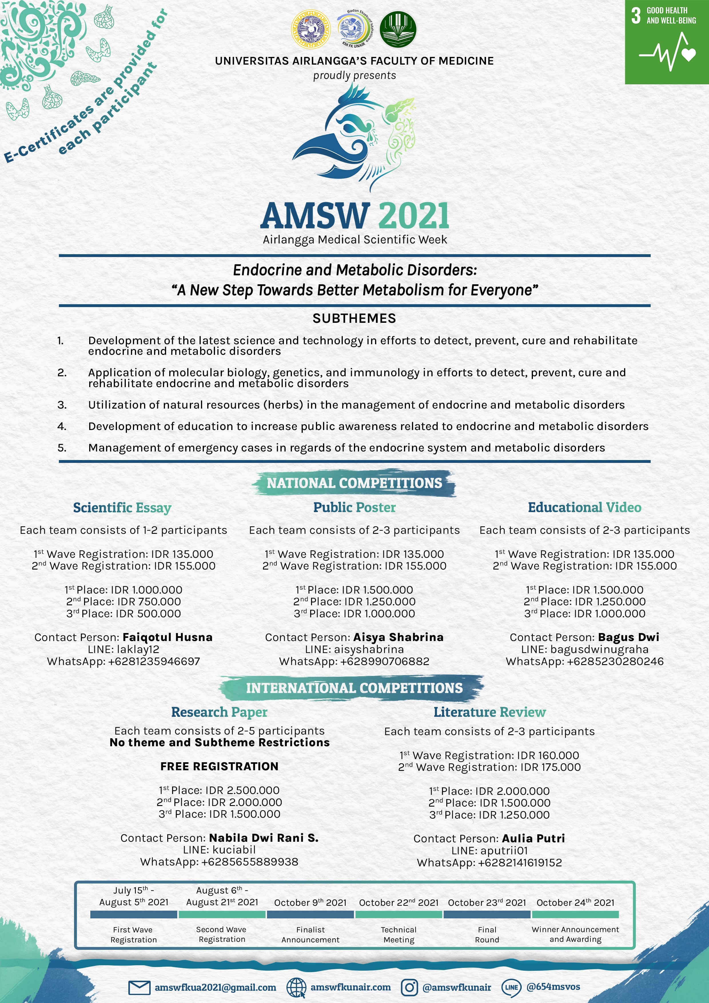 Airlangga Medical Scientific Week (AMSW) is an annual scientific event held by the Faculty of Medicine Airlangga University. AMSW opens opportunities for medical students in Indonesia and around the world to submit their works in the form of research papers, literature reviews, scientific essays, public posters and education videos.