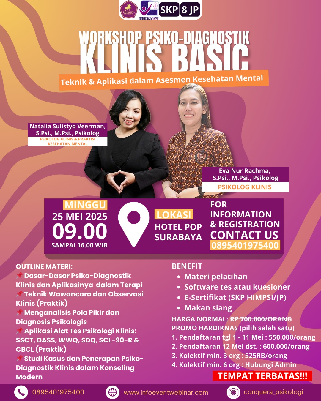 Sudahkah Anda membekali diri dengan keterampilan dasar yang esensial dalam asesmen klinis? Workshop Psiko-Diagnostik Klinis Basic ini dirancang khusus untuk Anda yang ingin memahami lebih dalam teknik observasi, wawancara klinis, penggunaan alat tes psikologi (SSCT, DASS, WWQ, SDQ, SCL-90-R, CBCL), hingga studi kasus praktis dalam konseling modern. 🧠✨