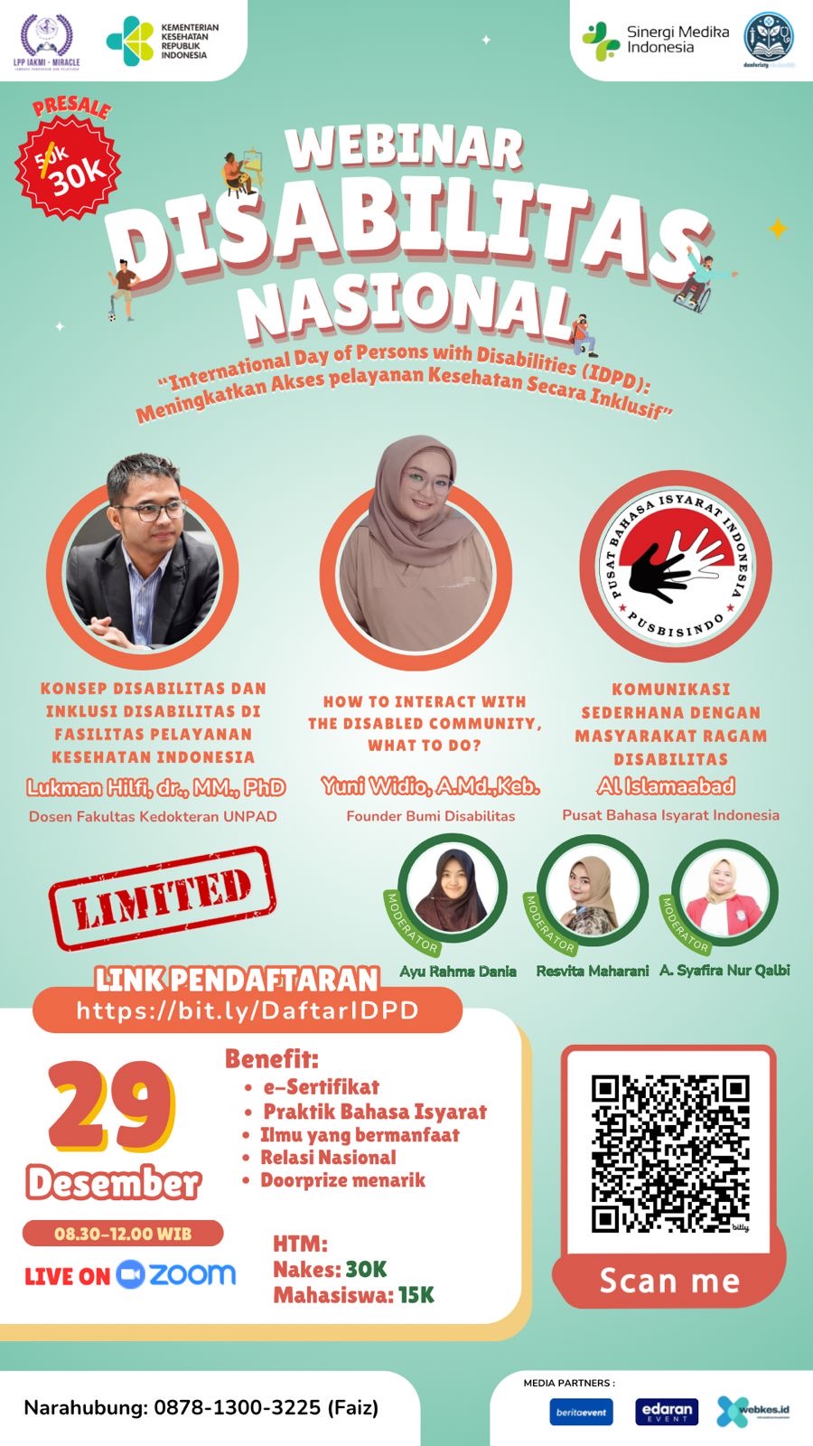Acara ini bertujuan untuk meningkatkan kesadaran pentingnya memahami pasien disabilitas di pelayanan kesehatan Indonesia. Pada webinar ini akan dijelaskan mengenai komunikasi sederhana dengan pasien disabilitas (bahasa isyarat) yang akan bermanfaat dalam pelayanan di fasyankes.