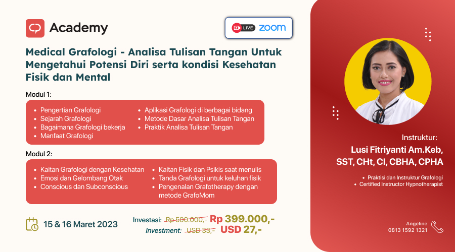 Mari selami seni grafologi bersama dengan Lusi Fitriyanti Am.Keb, SST, CHt, CI, CBHA, CPHA, beliau adalah instruktur ahli dan praktisi dalam dunia grafologi.