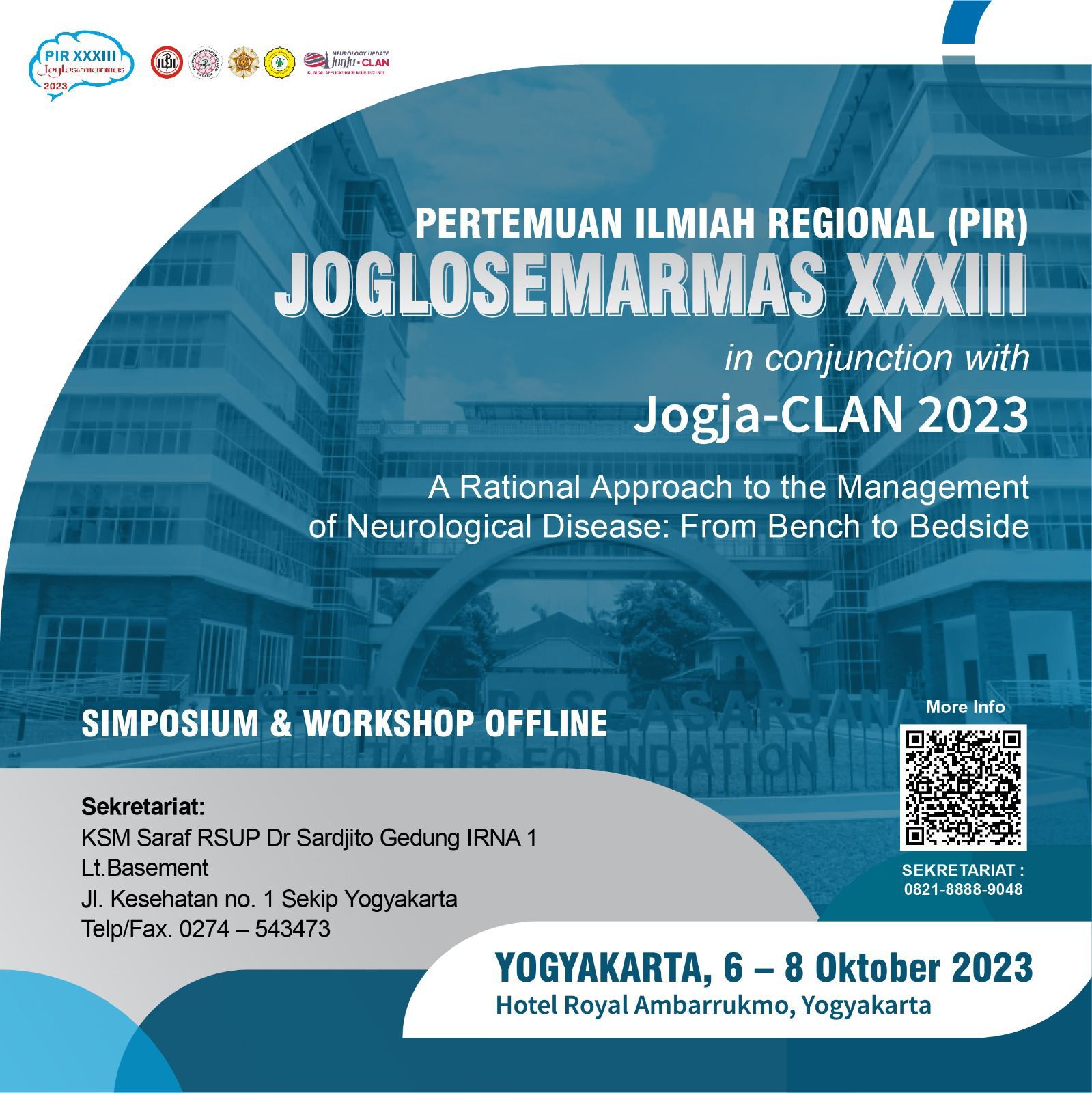 Perhimpunan Dokter Spesialis Neurologi Indonesia (PERDOSNI) Cabang Yogyakarta mengundang Prof/Dr/dr untuk turut hadir dalam acara PERTEMUAN ILMIAH REGIONAL (PIR) - JOGJACLAN 2023 dengan tema "A Rational Approach to the Management of Neurological Disease: From Bench to Bedside" yang diselenggarakan pada: