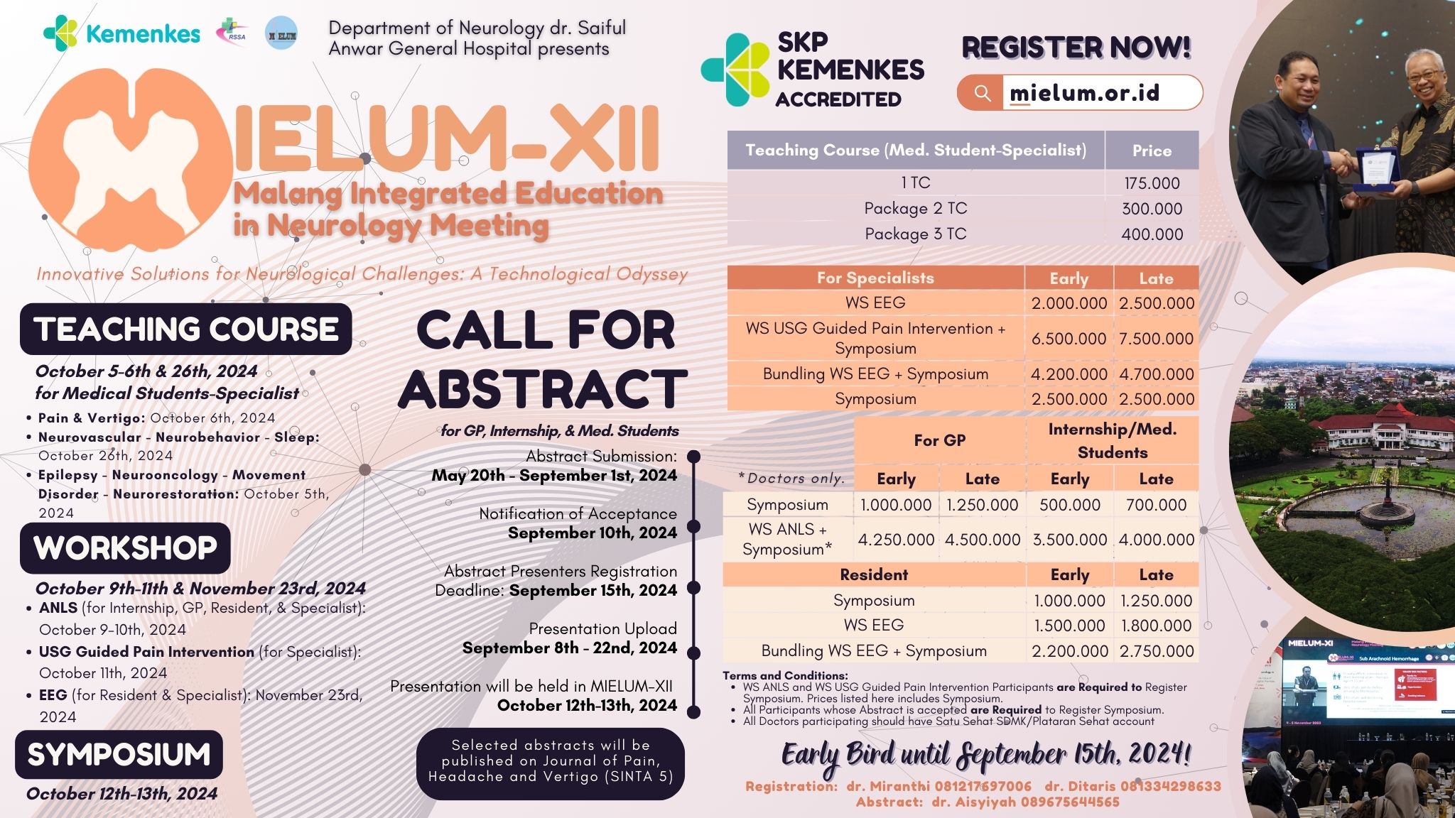 Malang Integrated Education in Neurology Meeting (MIELUM) merupakan rangkaian acara tahunan Pendidikan Kedokteran Berkelanjutan Departemen Neurologi RSUD dr. Saiful Anwar Malang. Kegiatan ini bertujuan untuk meningkatkan pengetahuan dan keterampilan di bidang neurologi bagi komunitas medis, mulai dari mahasiswa kepaniteraan hingga ahli saraf. Acara ini menawarkan Simposium, Teaching Course, dan Workshop yang komprehensif.